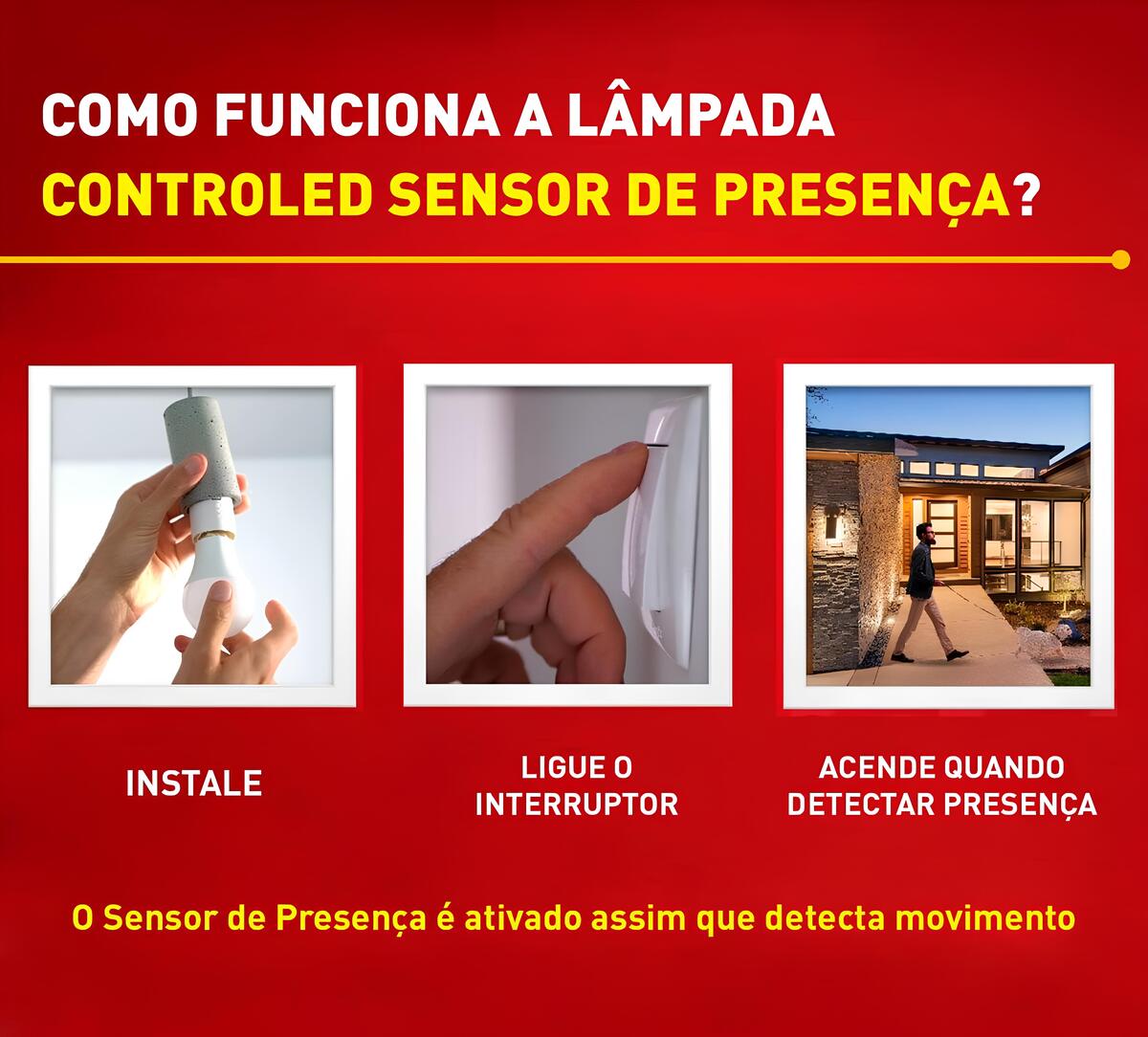 A Controled Sensor de Presença é uma lâmpada que possui sensor interno, ou seja, ao detectar a presença de uma pessoa ou movimento ela acende automaticamente e já vem pronta para uso, não precisa instalar nenhum equipamento extra. Caso tenha interruptor, manter sempre ligado. LÂMPADA ACESA/LIGADA A lâmpada acende automaticamente ao detectar presença de pessoas. LÂMPADA APAGADA/DESLIGADA A lâmpada apaga automaticamente na ausência de pessoas.