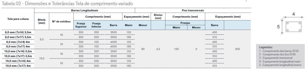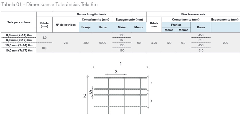 A Tela para coluna é produzida a partir da combinação de vergalhões SI50 e SI60, soldados entre si e espaçados à cada 200mm, com o comprimento total de 3,5m, 4m e 6m.