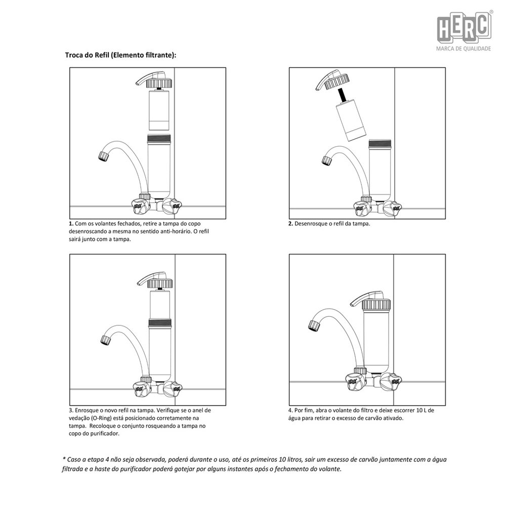 Para o bom funcionamento e conservação do produto substitua o refil do elemento filtrante a cada 6 meses de uso, 1.000 litros ou quando a vazão da água diminuir.
