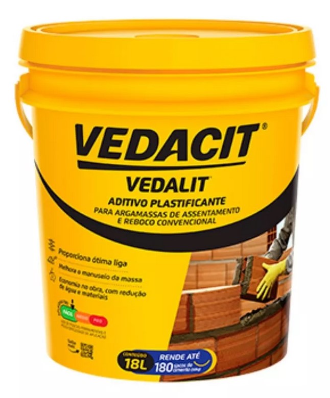 VEDACIT VEDALIT é um aditivo concentrado que proporciona ótima trabalhabilidade a argamassas e rebocos. Por ser líquido, facilita o trabalho, proporcionando economia de material e excelente acabamento. Agrega uma série de vantagens às argamassas: maior aderência, coesão, ausência de fissuras e menor exsudação. Argamassas preparadas com VEDACIT VEDALIT não precisam ser curtidas.
